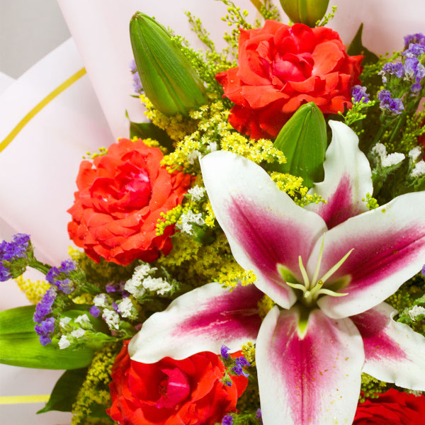 A charming red roses, and other flowers—this arrangement embodies elegance and warmth, blooming with beauty and heartfelt grace.