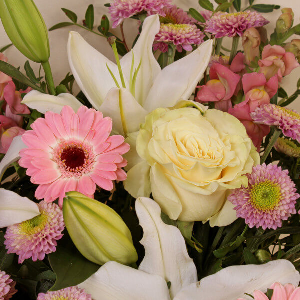 Spring is coming! This handcrafted combination of Gerimini, Antirhinum, Chrysanthemum and Lisianthus is just the trick to brighten that special someone’s day.