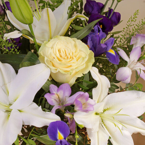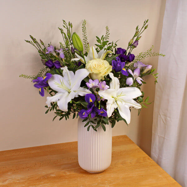 A wonderful gift for any occasion, this handcrafted bouquet of subtle white and purple blooms will provide delight and joy to all those who receive it. This bouquet will be handcrafted by an experienced florist, and delivered by hand.