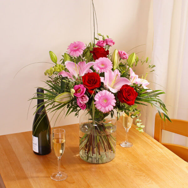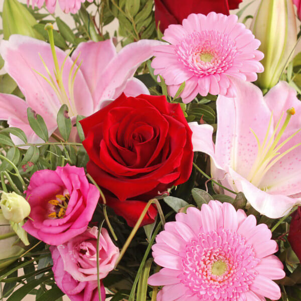The ideal handcrafted bouquet to express your love, this colourful combination of Germini, Lily, Lisianthus and Roses are fantastic Valentine’s flowers. Show your feelings with our hand tied flowers. This bouquet will be handcrafted by an experienced florist, order for same day delivery by hand, or next day delivery via our courier.